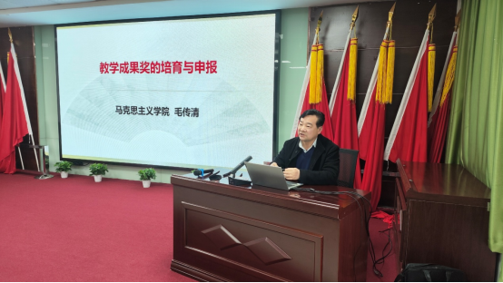 本次培训由学院院长毛传清主持并做了专题讲座,为学教学成果建设指明方向。他围绕高校教师教学成果奖的培育与申报的关键要点,从教学成果奖的培育、教学成果奖申报书的撰写与佐证材料两个角度出发,强调了教学成果选题方向的重要性以及申报的重要注意事项,由确定课题选题、把握研究价值、确立研究目标、细化研究内容、明晰研究思路、规范研究方法、实现重点和难点的突破等方面进行了深入细致的讲解。针对教学成果奖申报书的撰写与佐证材料准备工作,他指出申请书的撰写思路要连贯、内容要详实、格式要规范。他还非常详细的介绍了申报书的填报技巧,并结合优质申报书范例,从细节中梳理了课题申报的技巧方法。