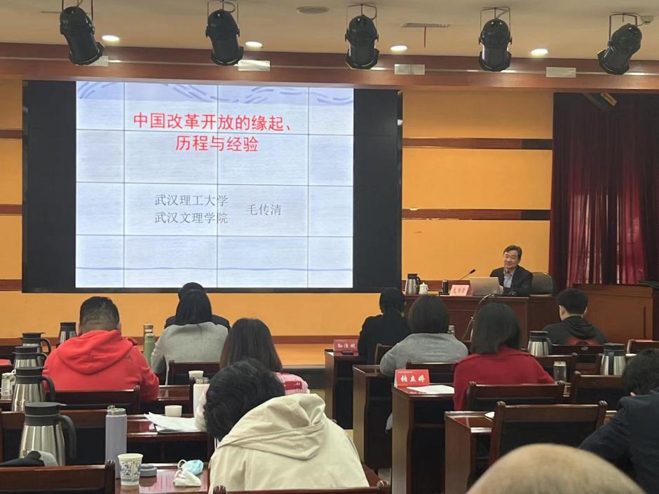 2023年3月10 日上午,我校澳门电子pg游戏官网院长、武汉理工大学毛传清教授应邀为2023年全省民主党派中青年骨干培训班授课。毛院长以“中国改革开放的缘起、历程与经验”为题,深入讲述了改革开放的历史前提和蕴酿探索、发展历程和基本特征、巨大成就和根本原因、伟大意义和基本经验,毛院长的讲课深入浅出,生动活泼,理论联系实际,材料数据丰富,既有思想高度和理论深度,又有很强的针对性和感染力,受到民主党派中青年骨干培训班学员的欢迎和承办方湖北省社会主义学院领导的高度评价。